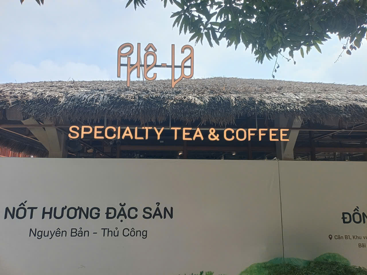 Biển bảng và nhận diện thương hiệu: Phần chữ "Phê La" và "Specialty Tea & Coffee" được thi công tinh xảo, sử dụng vật liệu có độ bền cao, kết hợp ánh sáng hắt tạo điểm nhấn sang trọng vào ban đêm.