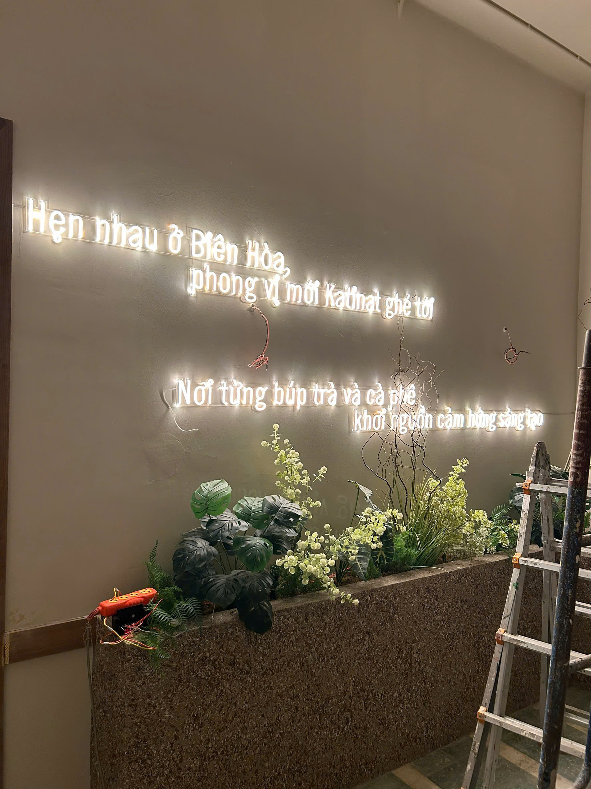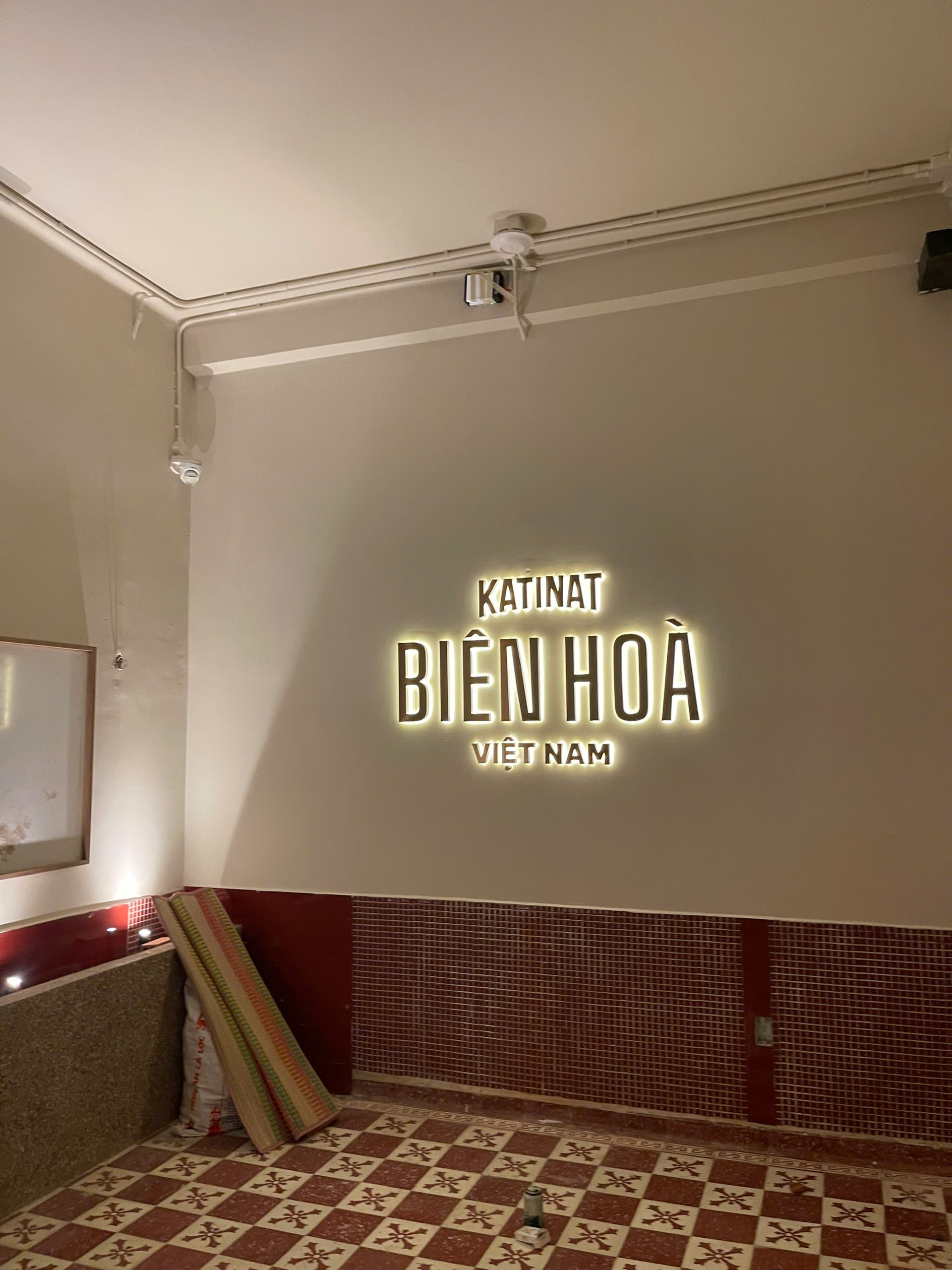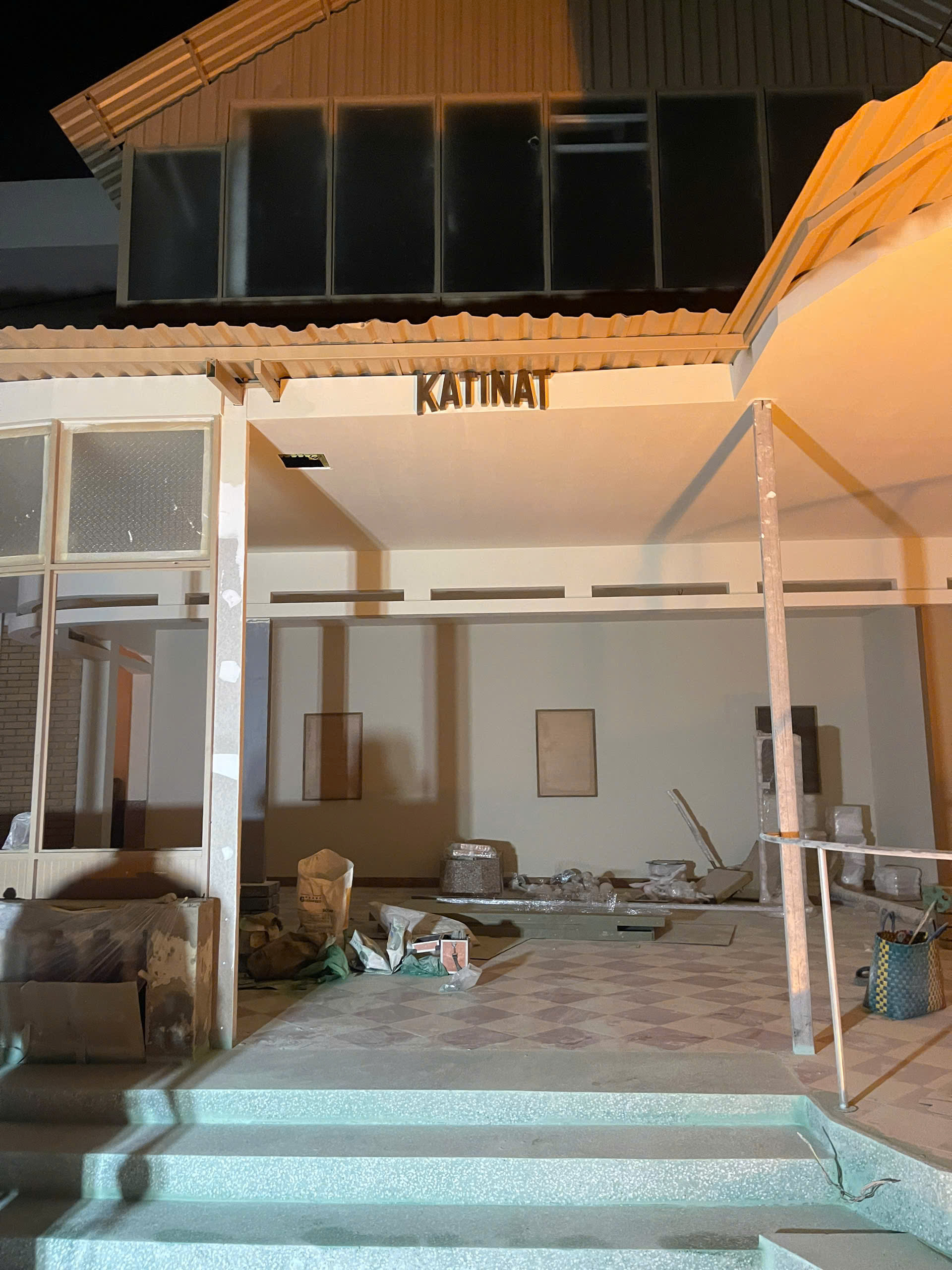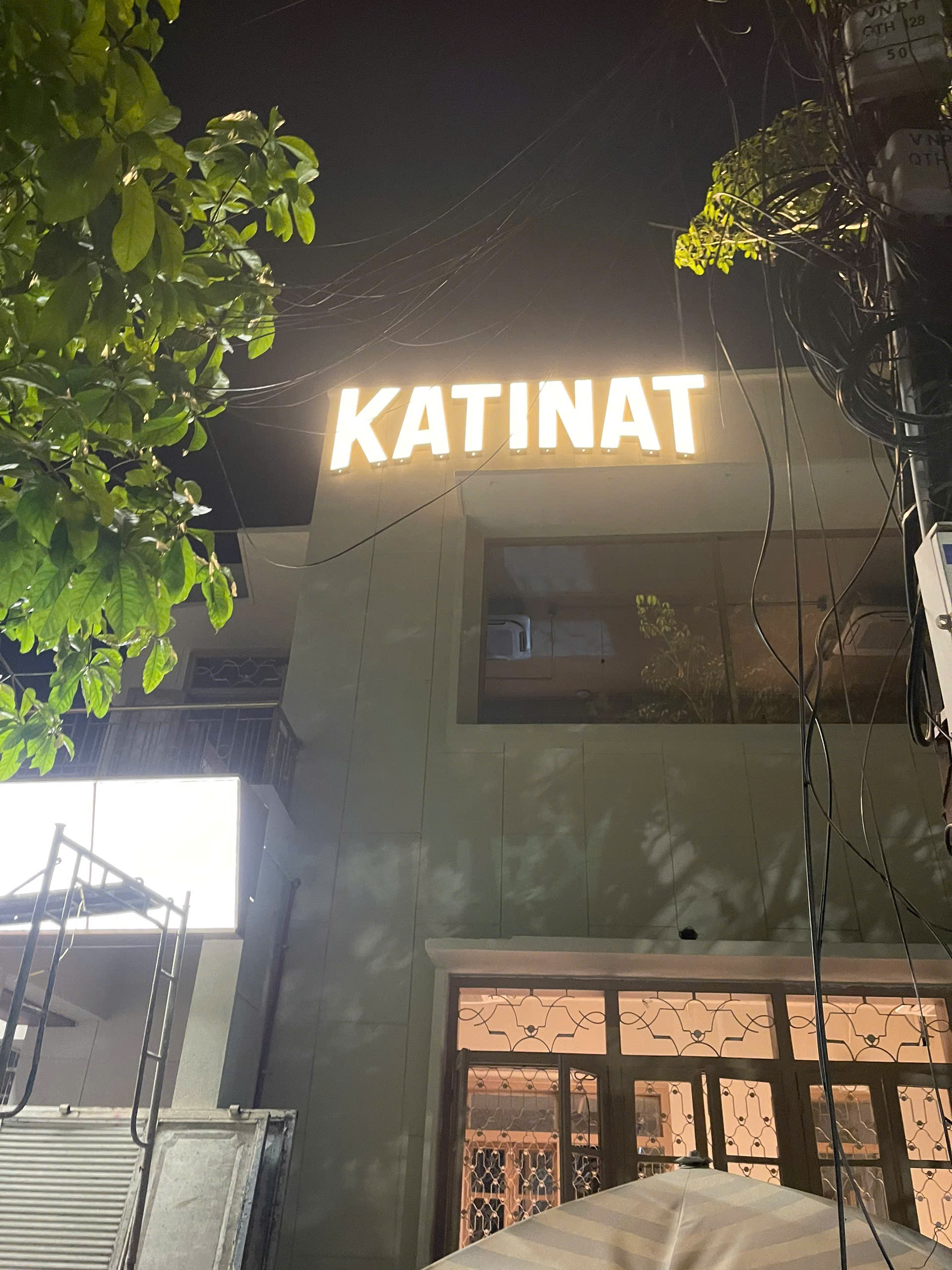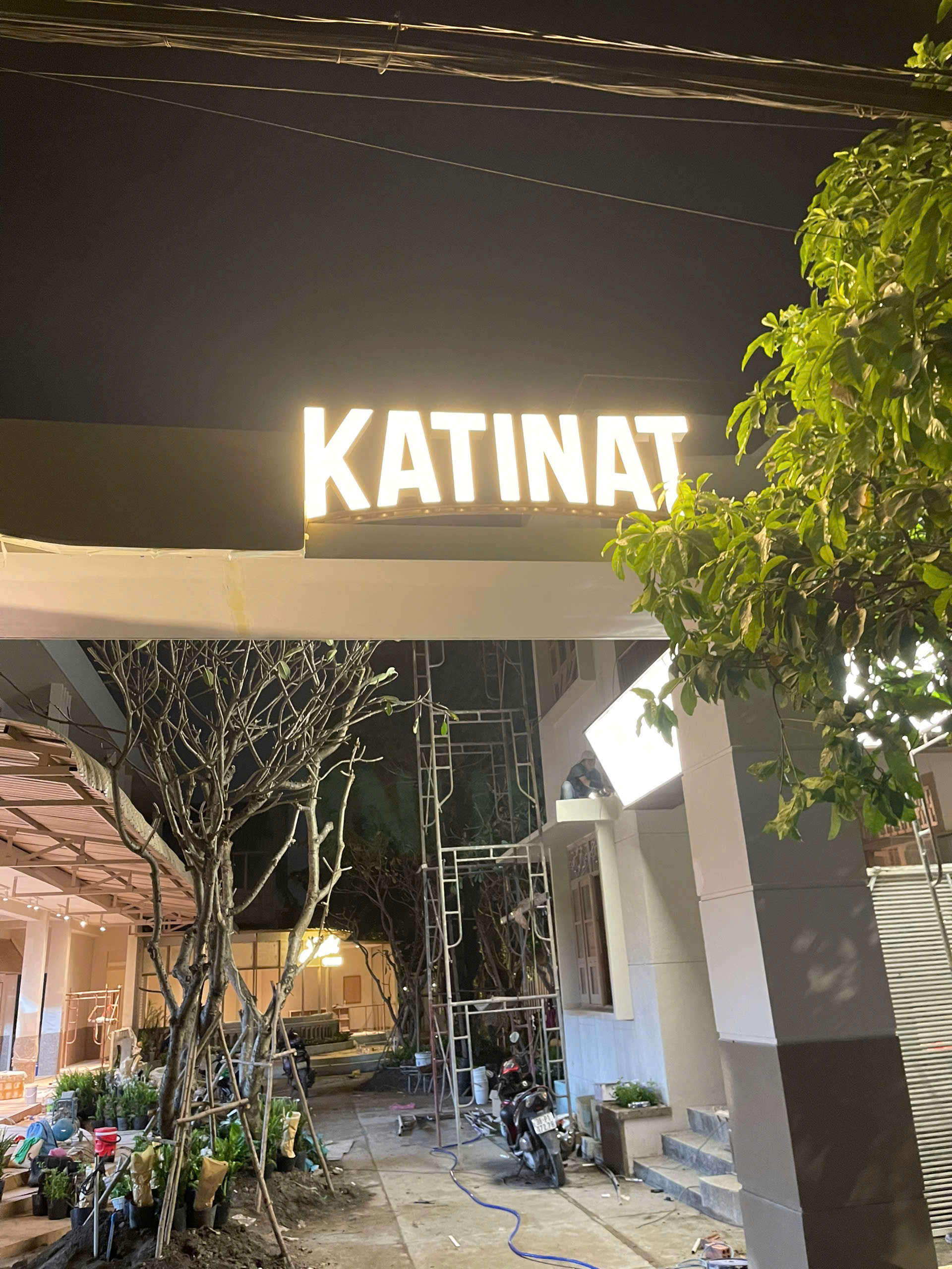 Hệ thống biển hiệu mặt tiền: Chế tác chữ "KATINAT" tinh xảo với hệ thống ánh sáng hắt chân hiện đại, đảm bảo sự nổi bật tuyệt đối cho thương hiệu vào ban đêm.