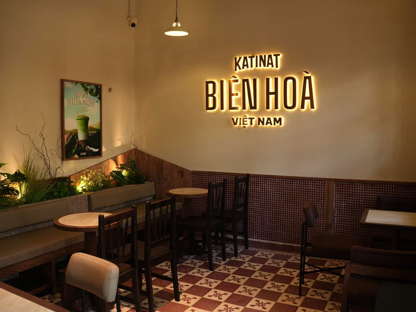 Xử lý nội thất tinh tế: Sự phối hợp nhịp nhàng giữa gạch mosaic cổ điển, tường nhám màu kem và các chi tiết ốp gỗ tạo nên tổng thể không gian đậm chất Katinat.