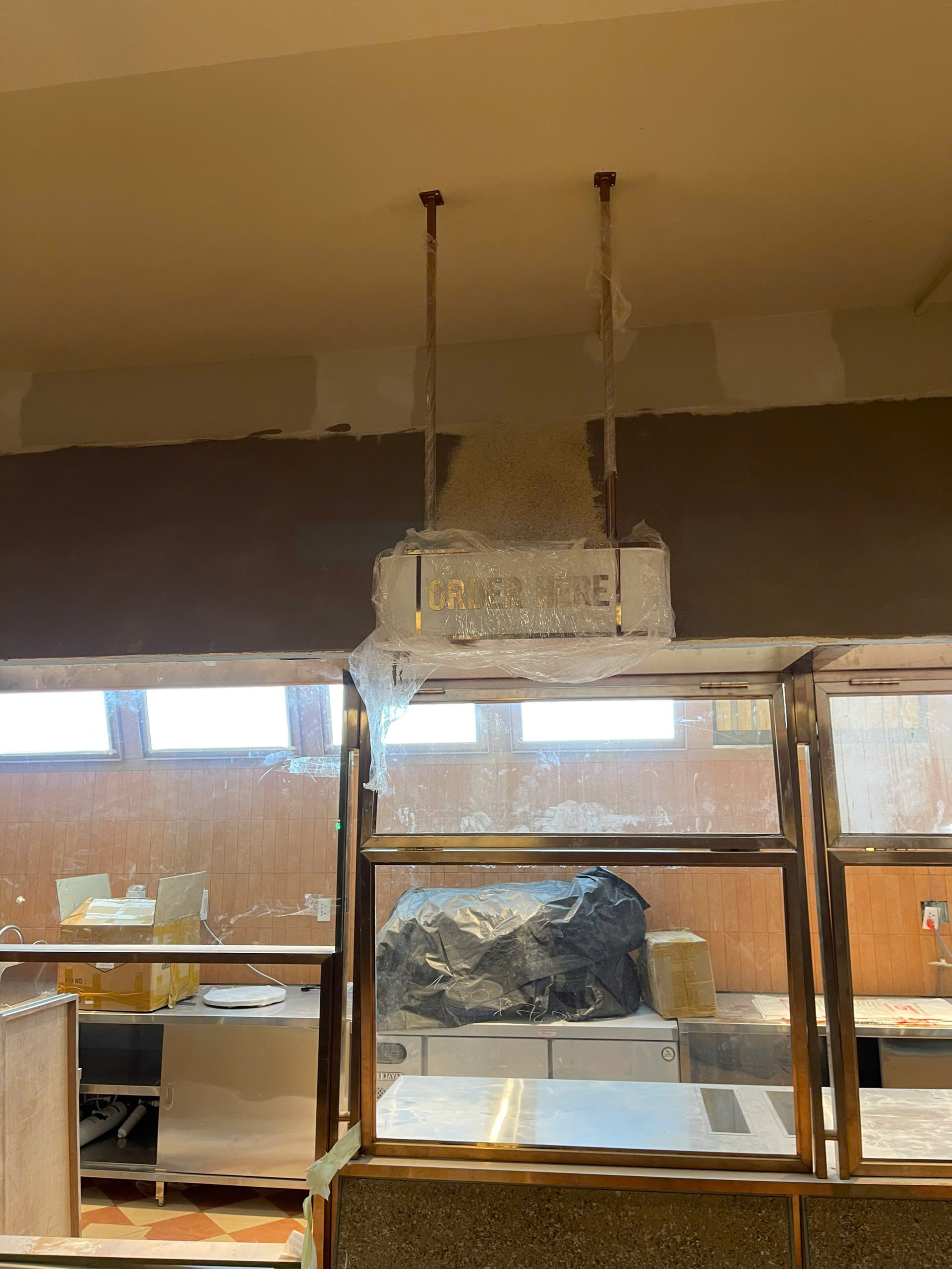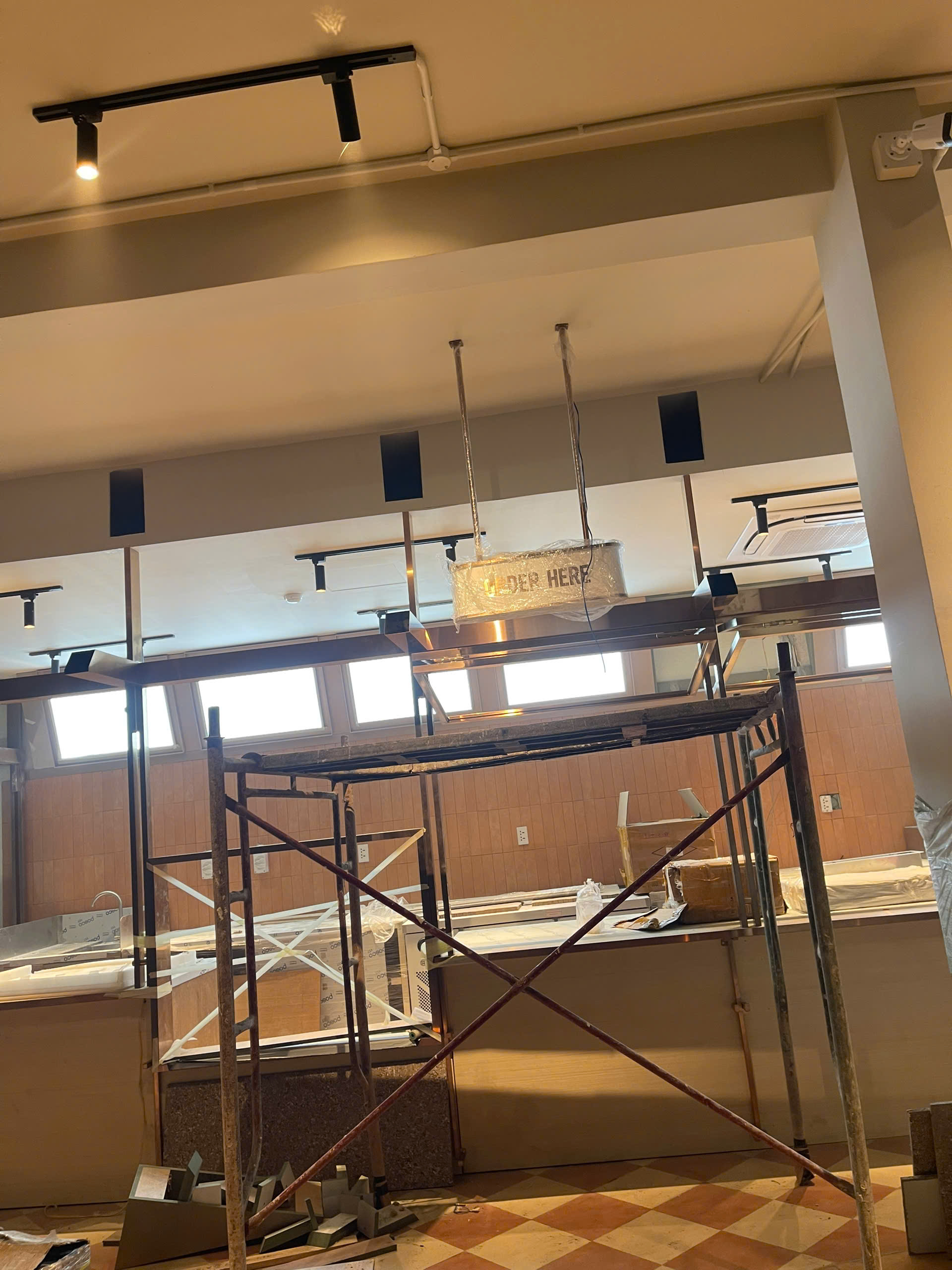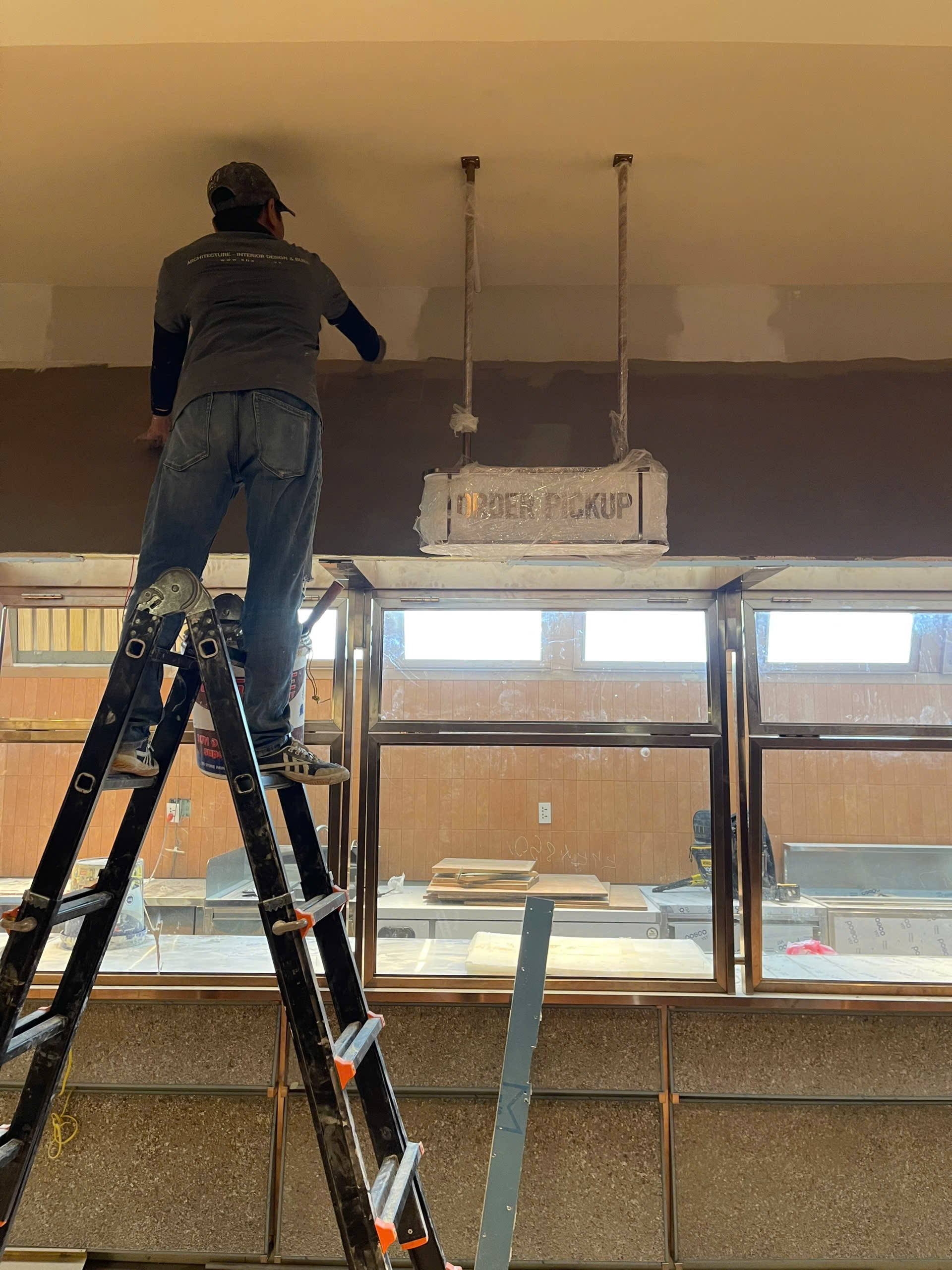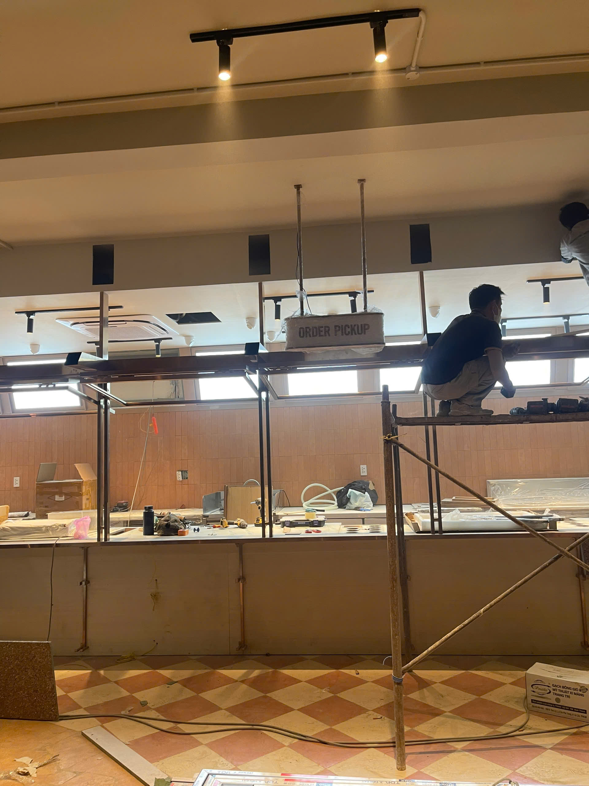 Thi công quầy Bar và khu vực Order: Lắp đặt hệ thống kệ inox vàng gương cao cấp, đi kèm các biển chỉ dẫn "ORDER HERE" và "ORDER PICKUP" được gia công tỉ mỉ, đồng bộ.
